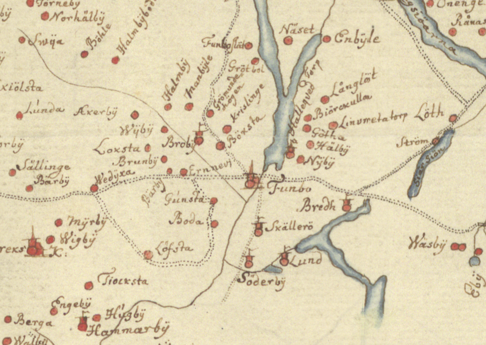 Skällerö, Lund och Söderby visas runt sjön Trehörningen på en äldre karta över Uppsala. Karta: Arkivmaterial.